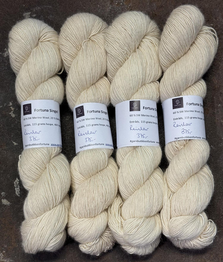 Fortuna Singel er et lekkert en-tråds garn i 60 % sw Merino Wool, 20 % Baby Alpaca, 20 % Mulberry Silk.