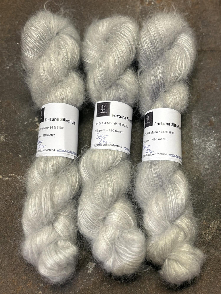 Lekkert garn i mohair og silkeblanding, 64 % Kid Mohair og 36 % Silke.