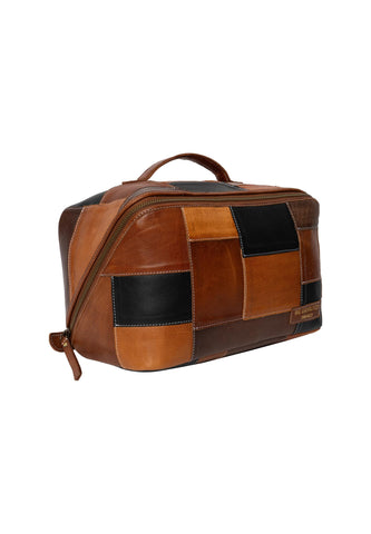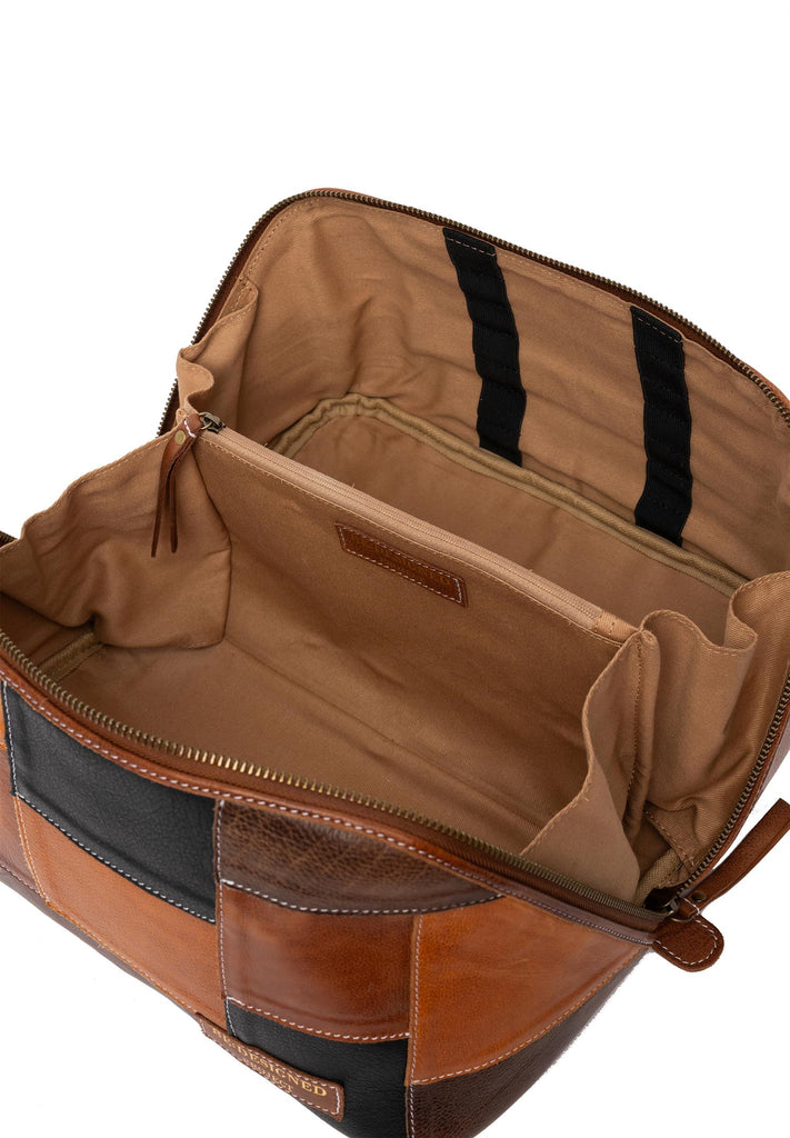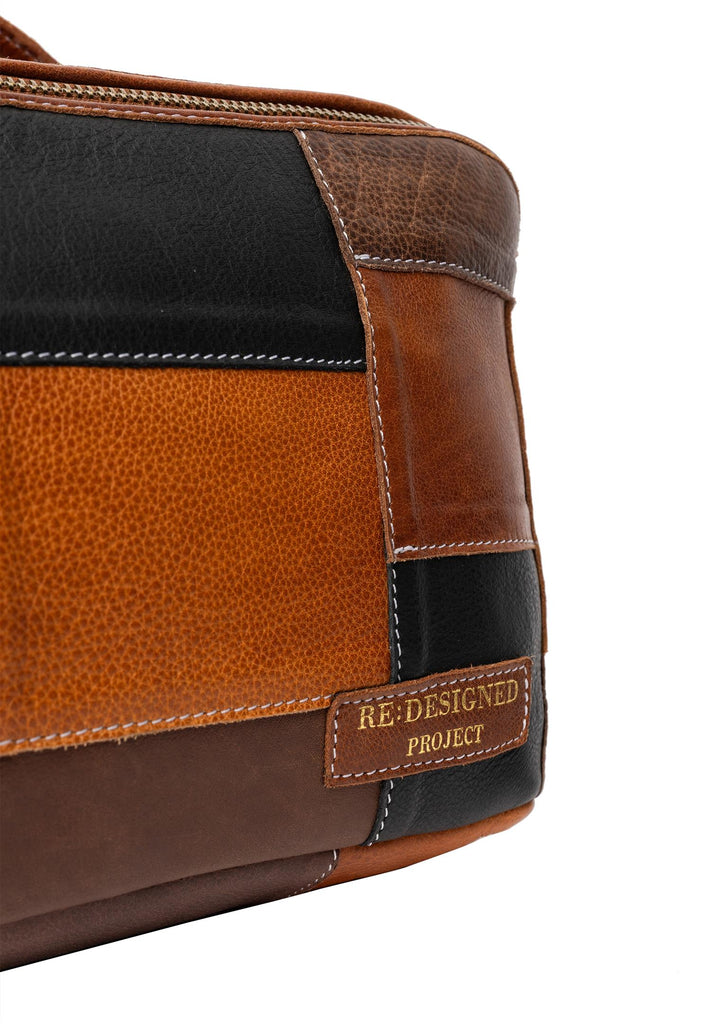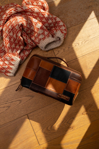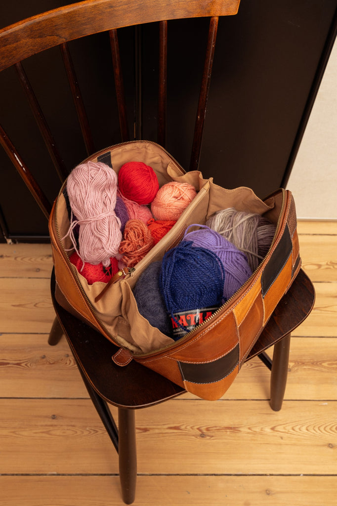 The waste leather is cut into smaller squares and stitched together carefully ensuring a unique and beautiful project bag where no two are the same.