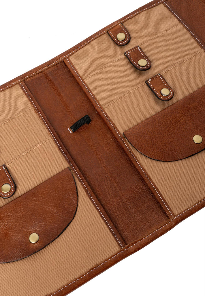 PROJECT 14 is our XL needle case for organizing your interchangeable circular knitting needles. It features 6 pockets with snap closures to securely hold your wires. Behind these pockets, there are open compartments where you can store knitting patterns or similar items. An elastic band allows you to keep your measuring tape handy, and there are 6 holes in the leather to accommodate 3 needles. A total of 18 slim pockets for knitting tips, crochet hooks of stocking needles, keeps them organized. Finally, you have 2 small pockets with flap and button closure where you can store your scissor and other loose knitting accessories. The entire needle case elegantly folds together and fastens with a snap, making it easy to carry your essential knitting tools.