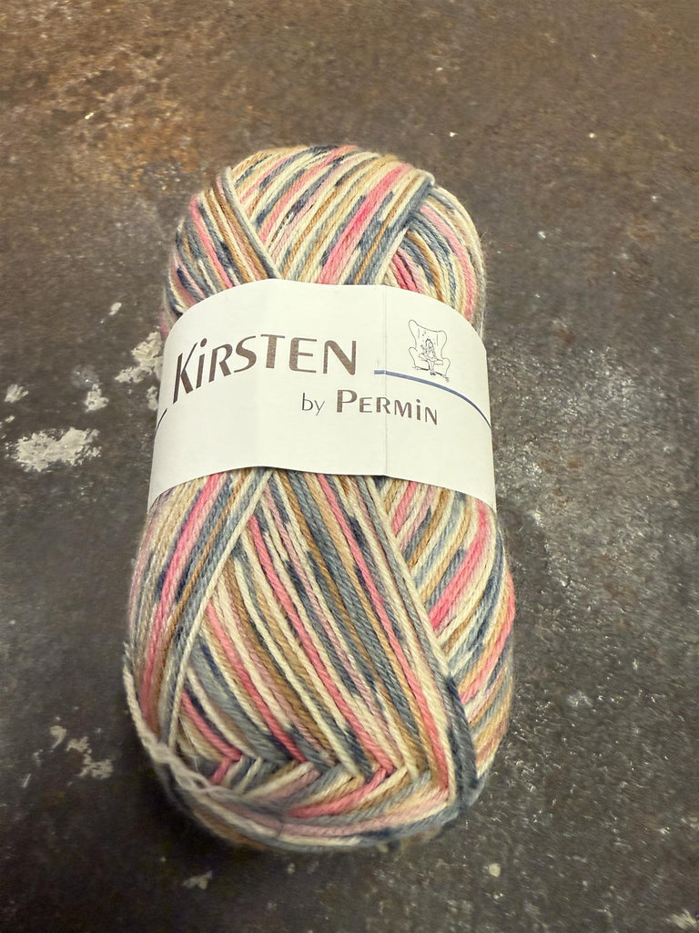 Kirsten by Permin består av 75% merinoull og 25% polyamid, med løpelengde på cirka 420 meter per 100 g nøste.