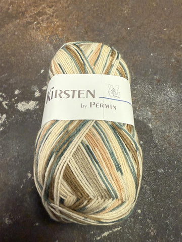 Kirsten by Permin består av 75% merinoull og 25% polyamid, med løpelengde på cirka 420 meter per 100 g nøste.