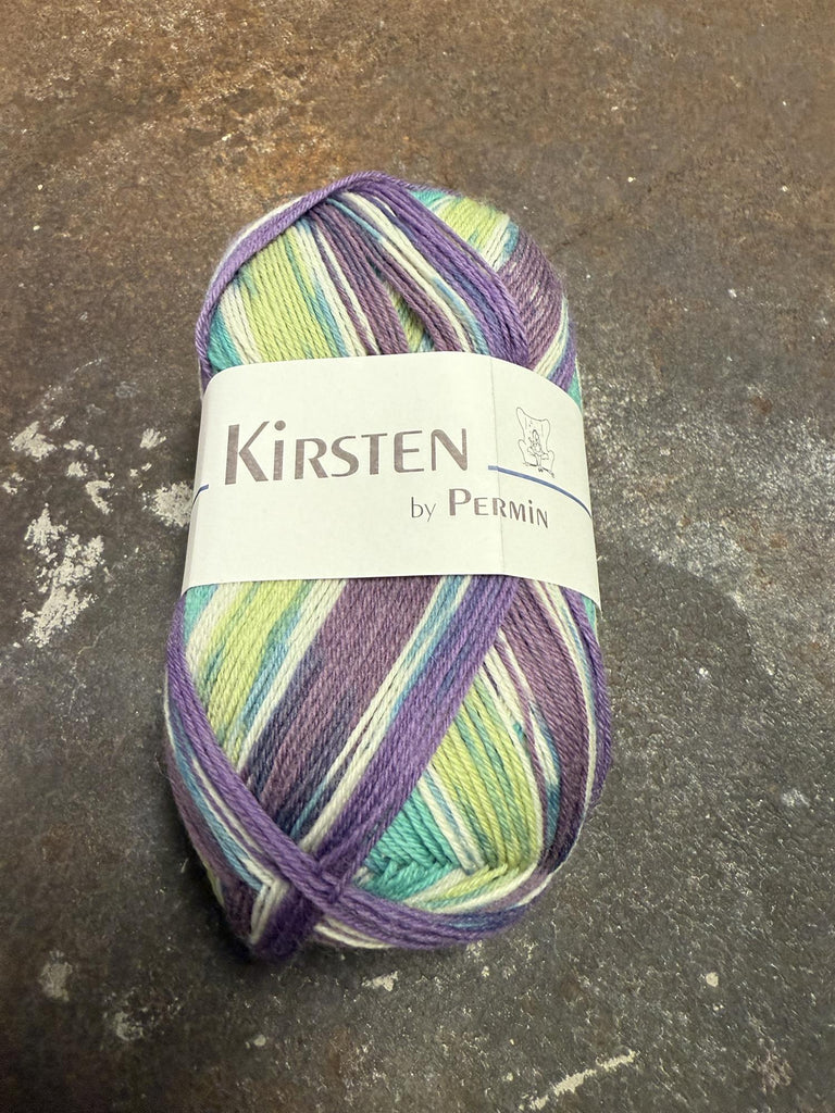 Kirsten by Permin består av 75% merinoull og 25% polyamid, med løpelengde på cirka 420 meter per 100 g nøste.