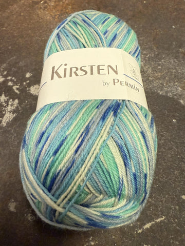 Kirsten by Permin består av 75% merinoull og 25% polyamid, med løpelengde på cirka 420 meter per 100 g nøste.