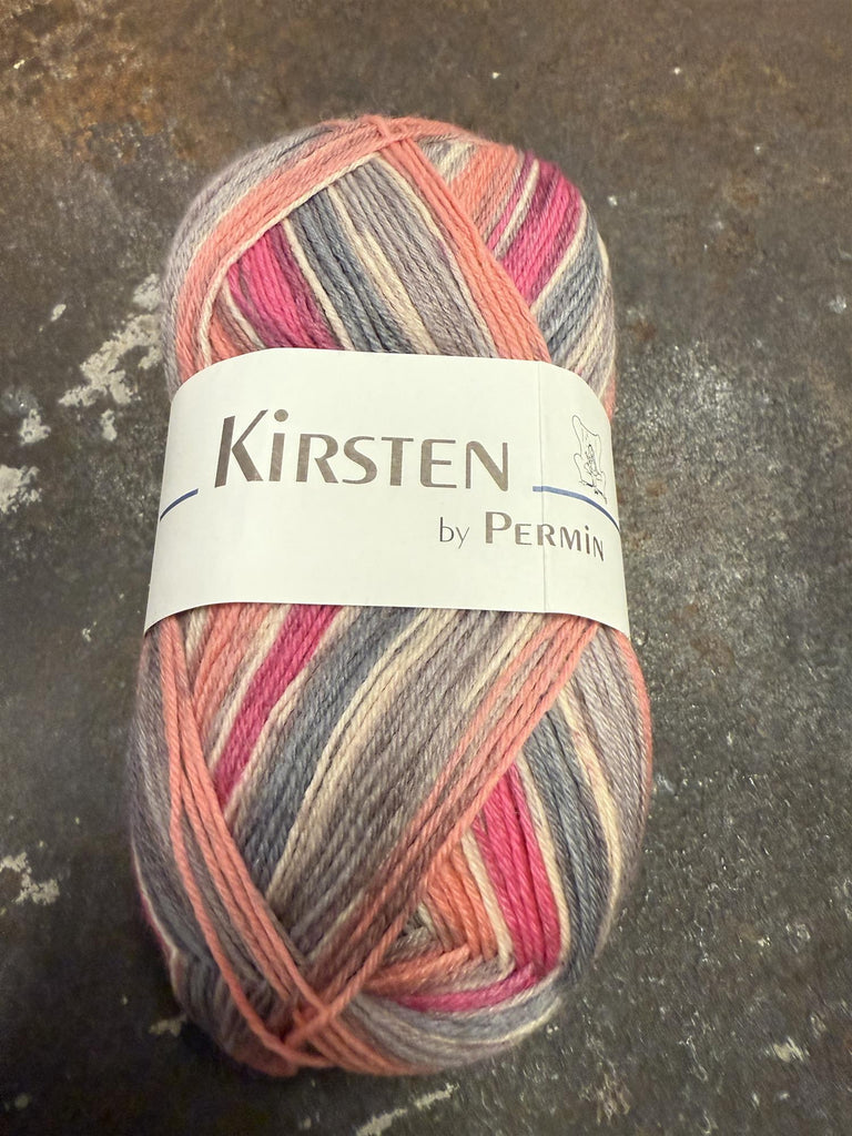 Kirsten by Permin består av 75% merinoull og 25% polyamid, med løpelengde på cirka 420 meter per 100 g nøste.