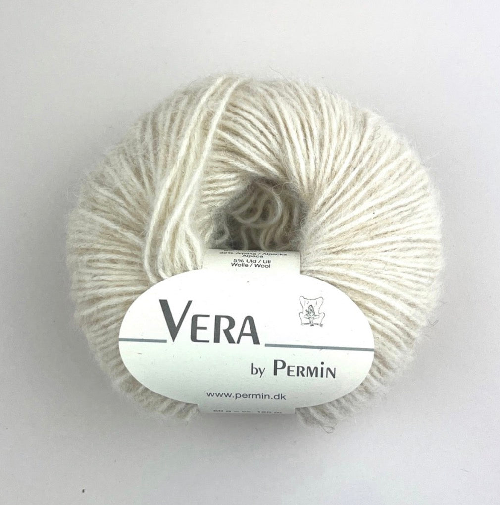 Vera by Permin består av 65% Bomull, 30% Alpakka og 5% ull. Alpakkaullen gir garnet en fin luftighet og en lekker elastisitet og den store andel av Alpakka, gjør Vera særlig velegnet til folk med allergi eller følsom hud. Alpakkaull er også temperaturregulerende og puster og derfor egnet til både kalde og varme temperaturer.