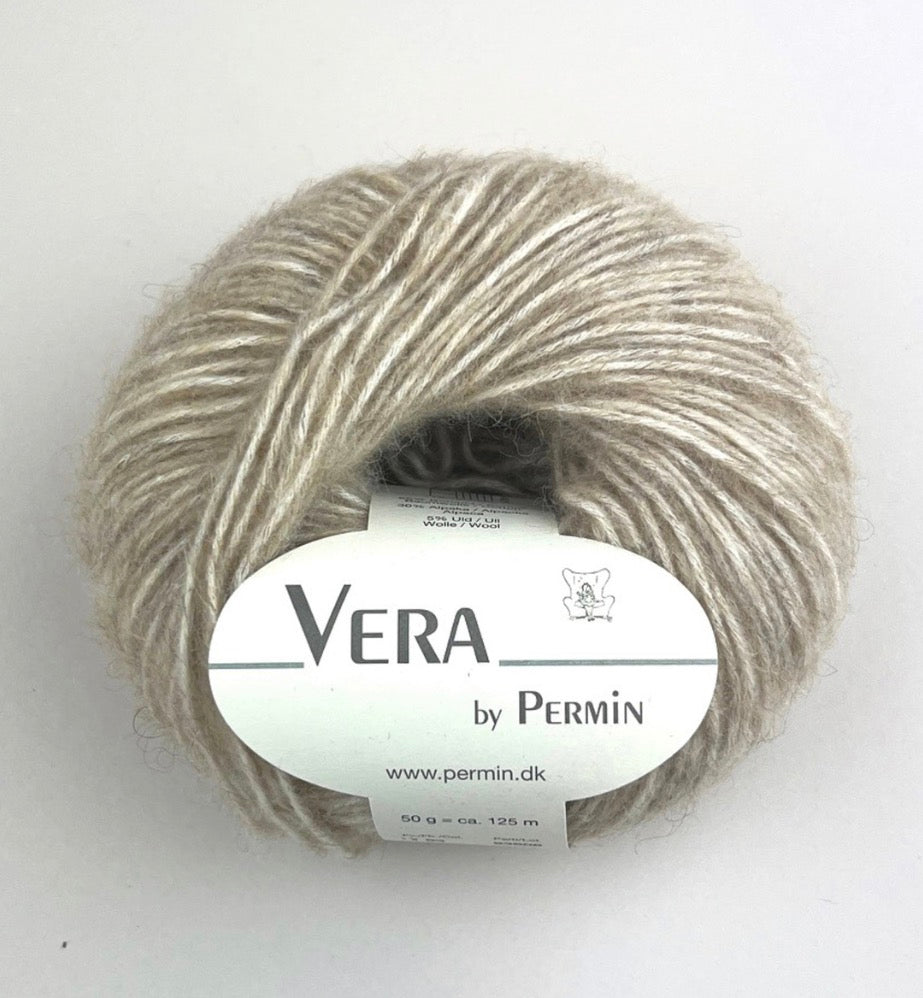 Vera by Permin består av 65% Bomull, 30% Alpakka og 5% ull. Alpakkaullen gir garnet en fin luftighet og en lekker elastisitet og den store andel av Alpakka, gjør Vera særlig velegnet til folk med allergi eller følsom hud. Alpakkaull er også temperaturregulerende og puster og derfor egnet til både kalde og varme temperaturer.
